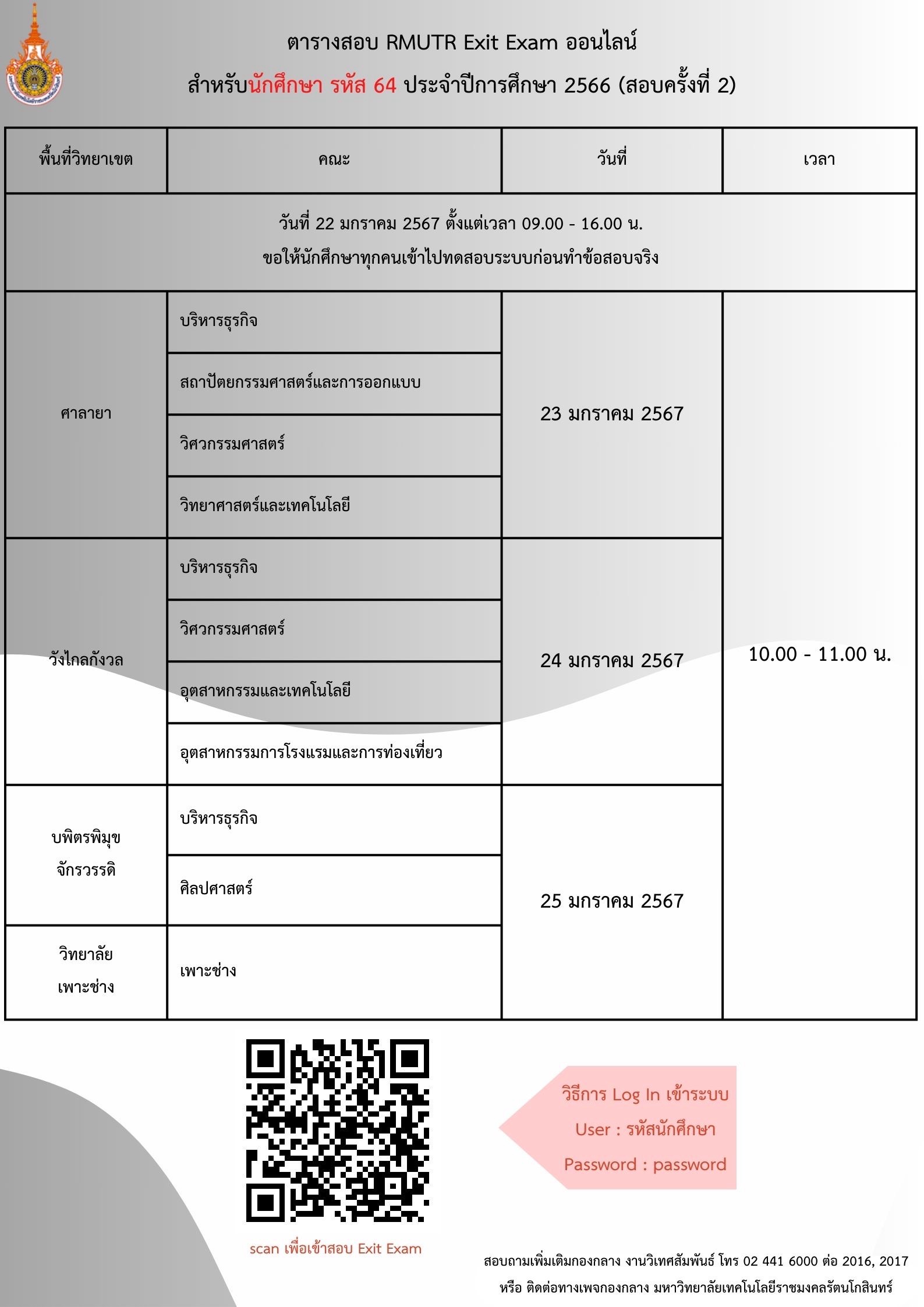 ตารางสอบและรายชื่อนักศึกษารหัส 64 ที่ต้องสอบ Exit Exam ครั้งที่ 2