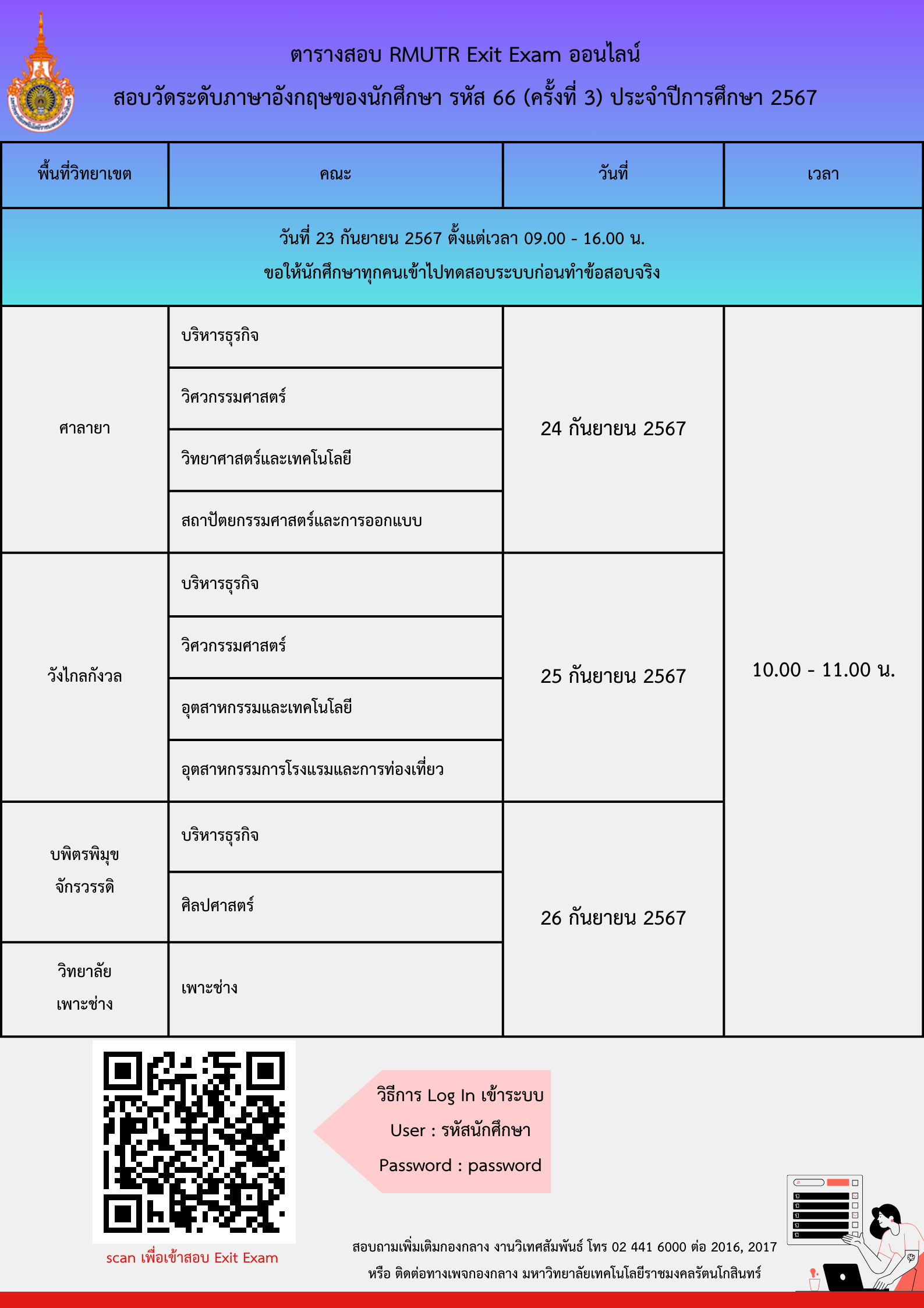 ตารางสอบและรายชื่อนักศึกษารหัส 66 ที่ต้องสอบ RMUTR Exit Exam (ครั้งที่ 3)